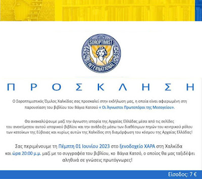 Ο Σοροπτιμιστικός Όμιλος Χαλκίδας σας προσκαλεί στην εκδήλωση παρουσίασης του βιβλίου «Οι άγνωστοι πρωτοπόροι της Μεσογείου», την Πέμπτη 1η Ιουνίου, στο καφέ του ξενοδοχείου Χαρά στη Χαλκίδα, στις 8 το βράδυ.